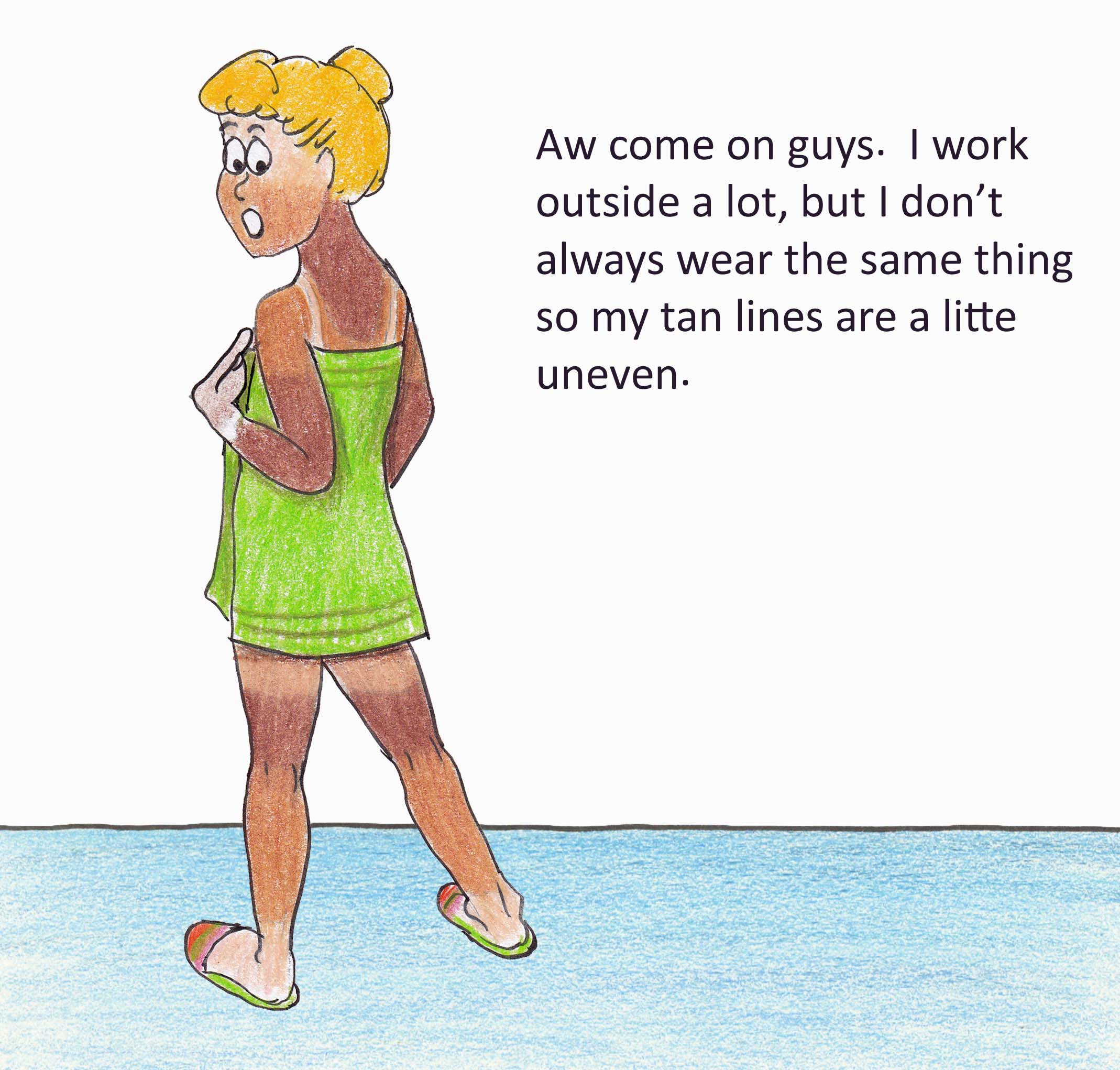 LOL THAT MADE ME LAUGH LOTS COS I AM VERY FAIR SKINNED BUT IN SUMMER I DEVELOPE WHAT HERE I HAVE HEARD CALLED A “FARMERS TAN ” ON MY ARMS AND ACE !!!!! I JUST WEAR SHORT SLEEVED T-SHIRTS !AND NEVER EVER SHOERTS !