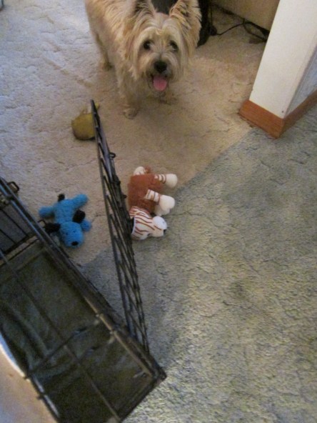 Toby gets a tiny treat whenever he goes into his kennel. He insists that his toys also get a treat (which Toby kindly eats for them).